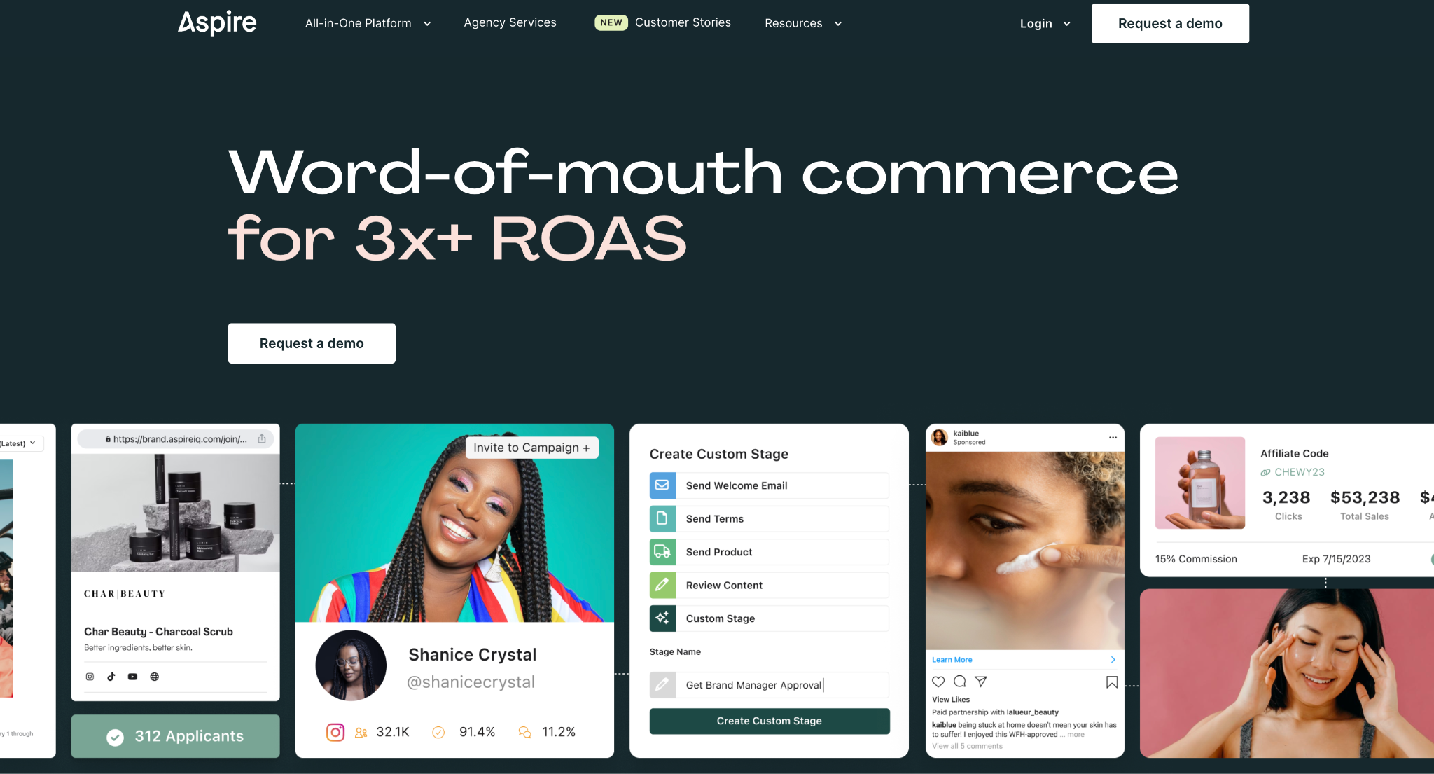 Aspire is a creator marketing platform that supports programs like product seeding, affiliates, and UGC for paid ads. It differentiates with word-of-mouth commerce positioning and publishes a claim of $5.78 earned for every $1 spent on influencer marketing on its homepage.