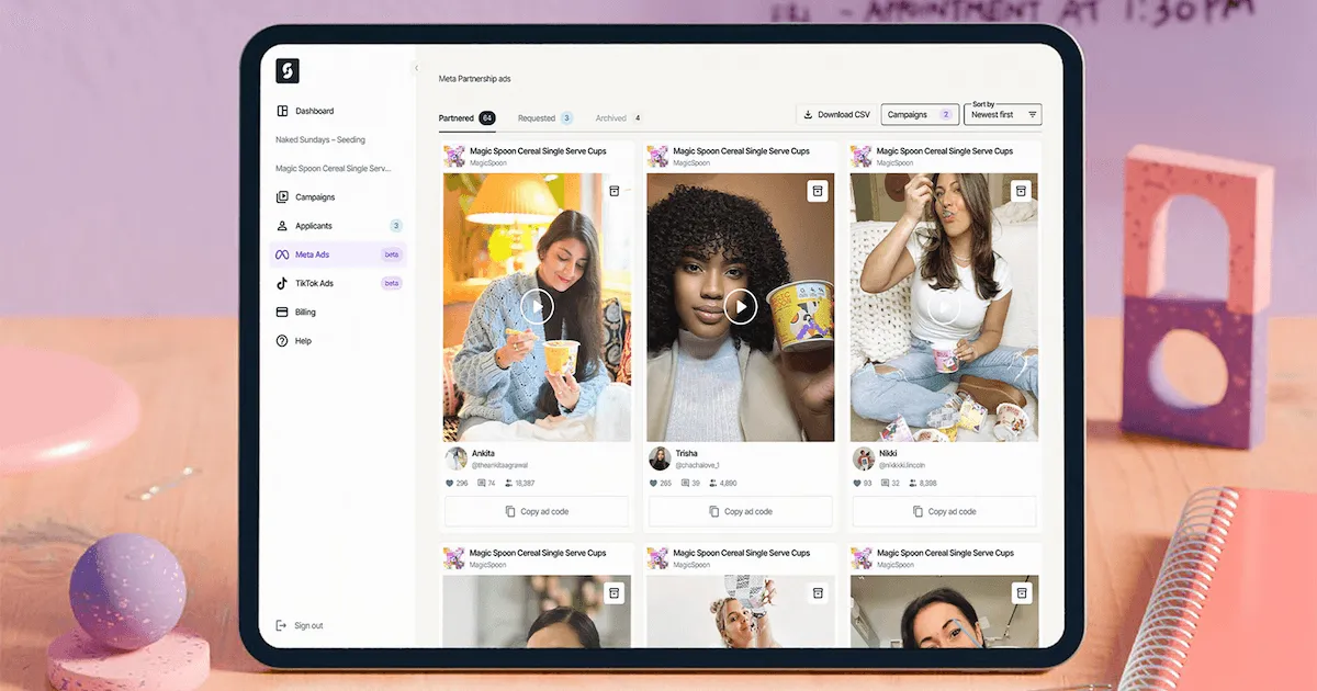 - Better testing speed. A single creator collaboration can generate multiple ad variations, which supports faster creative iteration and clearer learning.