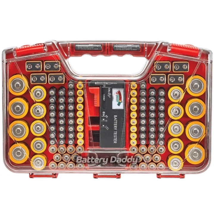 Battery Daddy™ is the ultimate battery storage system with its unique double-sided design that stores and organizes up to 180 batteries! With Battery Daddy™ each battery is kept safe and secure in a customized slot. The clear locking lid allows you to see which batteries you have with ease. It fits in any cabinet, drawer or shelf. And it comes with a battery tester too!