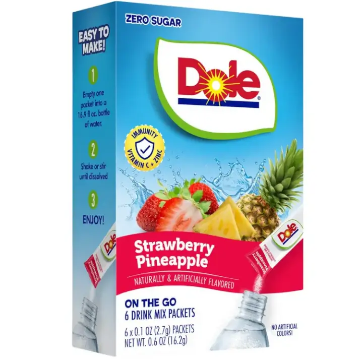 Dole’s fresh and exotic fruit flavors can go with you everywhere in an easy on-the-go packet! Bursting with sweet tropical taste, zero sugar and no artificial colors, Dole’s Strawberry Pineapple drink mix elevates your hydration enjoyment and brings a refreshing clear splash of fruit. To use, simply mix 1 packet with 16 fl. oz of water. Shake or stir until dissolved. Enjoy!