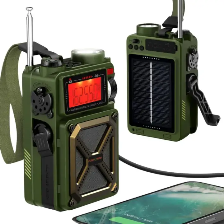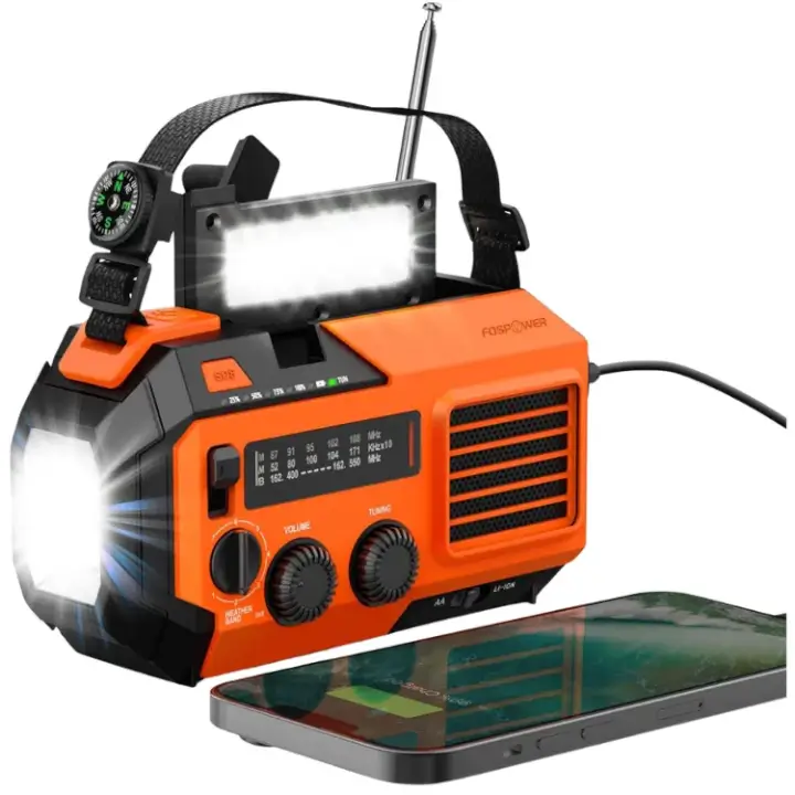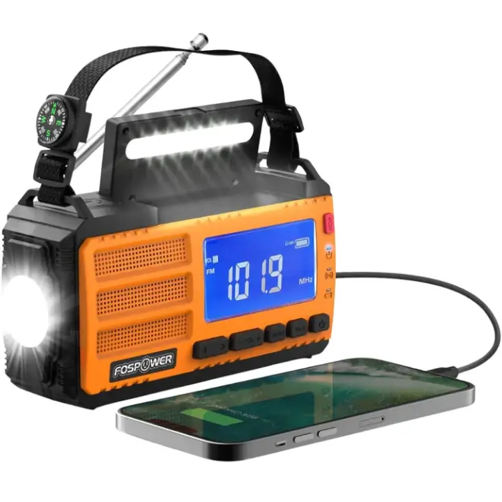 FosPower's Model D9 Emergency Weather Radio is a compact, versatile device. With its 4000mAh power bank, it keeps you powered and connected during emergencies. It offers multiple charging options, including USB-C, hand crank, and solar. The radio features AM/FM/WB broadcasts, phone charging, flashlight, compass, and SOS alarm.