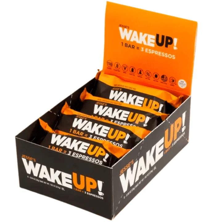 Jesse’s WakeUP! (1 Bar = 3 Espressos) is a dark chocolate rice crispy bar that is infused with 250mg of plant-based caffeine. Vegan, Gluten Free, Kosher Ingredients, Non-GMO, Dairy Free, Soy Free, Egg Free. This highly potent & delicious tasting bar was made for one purpose... WakeUP! Anytime, Anywhere.