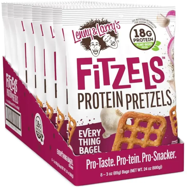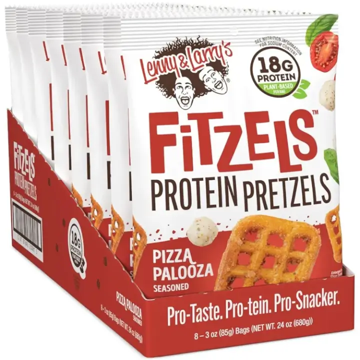 Lenny & Larry's Fitzels™ Pizza Palooza Protein Pretzels pack 20g of plant-based protein into each 3 oz bag. These crunchy, vegan-friendly snacks feature bold pizza flavor with no soy, high fructose corn syrup, or artificial sweeteners—perfect for on-the-go fuel or post-workout cravings.