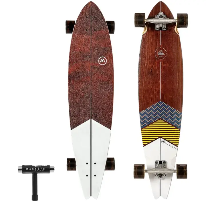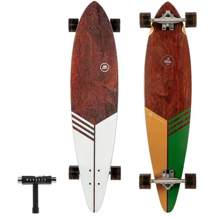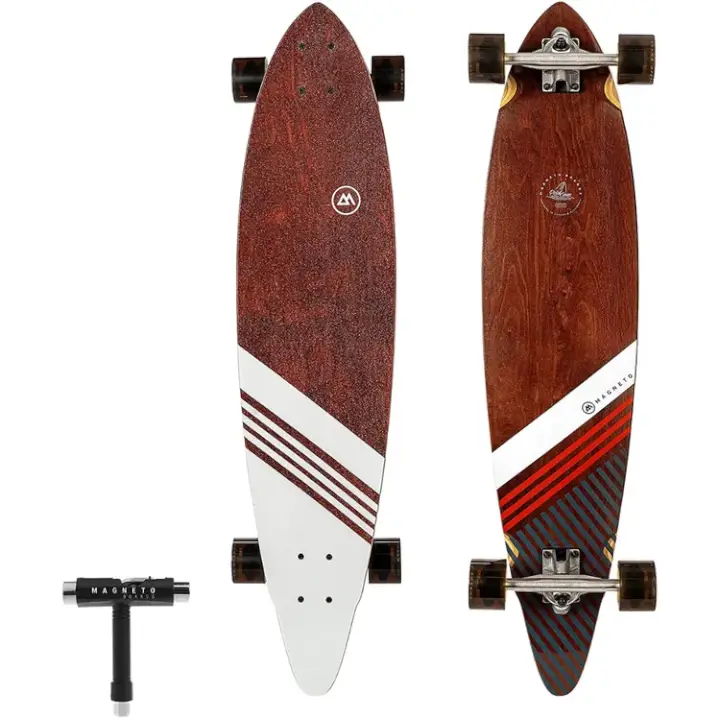 The Pintail Series is our modern take on a classic shape. These boards are surf inspired and are made for cruising and carving. Made with a dark stained maple veneer with clean graphics and crisp lines. They are finished with a clear sand grit finish to show off the beauty of the deck while still providing good traction. The Classic shape is as traditional as it gets.
