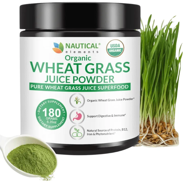Nautical Elements Wheat Grass Juice Powder Organic is harvested at peak nutrition from certified organic farms and grown in mineral-rich soil. Using a gentle BioActive Dehydration™ process, it delivers vibrant color, smooth texture, and a clean, fresh taste—perfect for blending into water, juices, or smoothies.