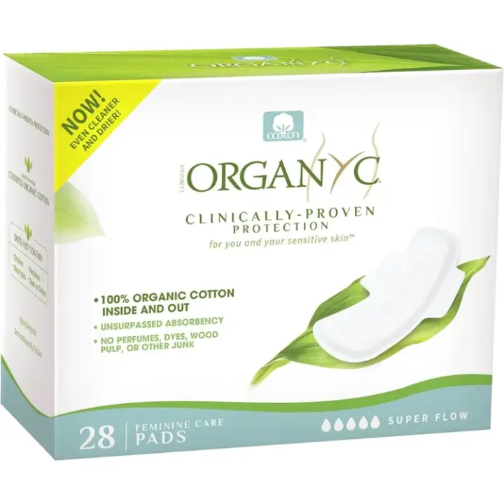 New and improved Organyc Overnight Pads - Cleaner, Drier, and More Naturally Absorbent. Clinically-Proven protection for you and your sensitive skin. 100% certified organic cotton inside and out with unsurpassed absorbency, and no perfumes, dyes, colors, wood pulp or other junk. Our new release of overnight pads for super flow is this larger size packaging - 28 count pack.