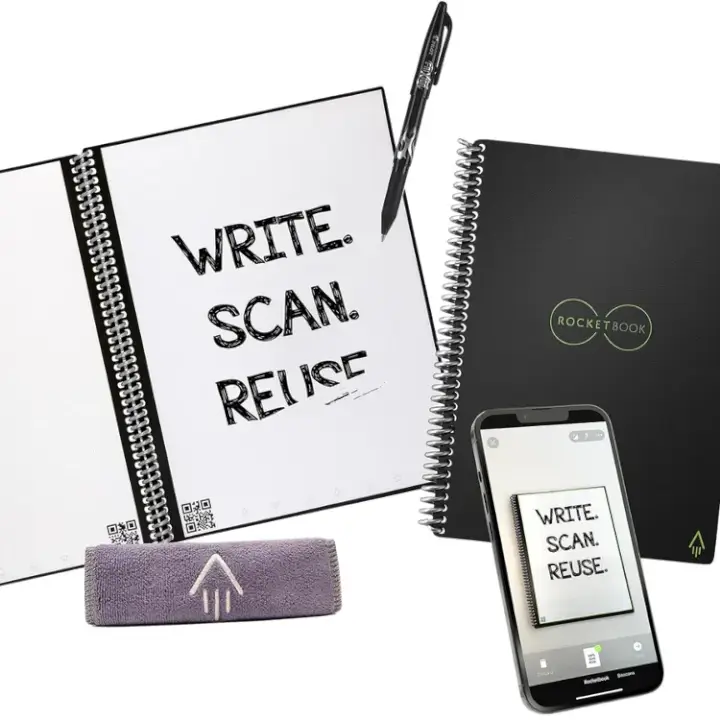 The Rocketbook Core is a reusable notebook with over 73,000 reviews on Amazon. It features Rocketbook’s patented reusable technology that lets you write on the page, scan it using the Rocketbook App and then wipe the page clean with a damp cloth so you can use again it and again.