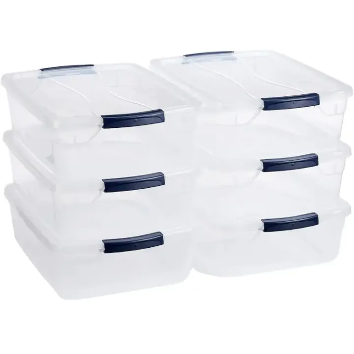 Cleverstore Clear 17 Quart bins feature a straight-wall design, holding 14% more than comparable boxes. Made from shatter-resistant, BPA-free plastic, these durable, food-safe bins have latching lids for secure stacking and protection from dust and pests. Square-edge handles fit neatly in cabinets and closets. Dimensions: 18.75" L x 13.375" W x 6.625" H. Made in the USA.