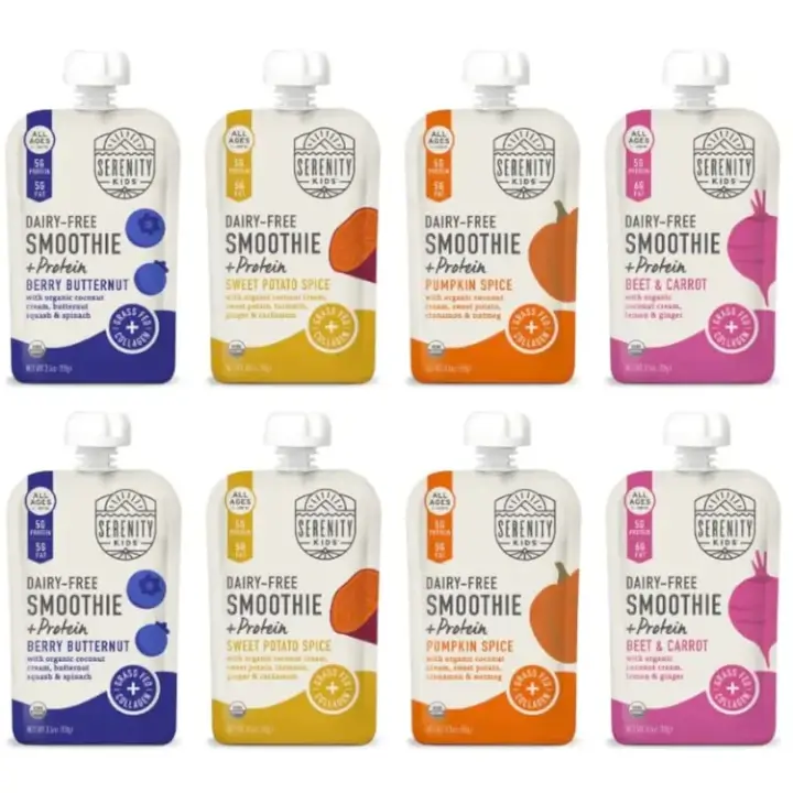 Skip the blender and save yourself the prep work and mess with these delicious shelf stable dairy-free smoothies! Your little one will reap the benefits of unique flavor combos and nutrient dense ingredients in a convenient and mess-free smoothie pouch. And you'll feel good knowing that they're still getting the nutritional benefits of a low sugar smoothie. Each smoothie pouch recipe is packed with organic veggies alongside high quality protein with grass-fed collagen and fats from organic coconut cream.