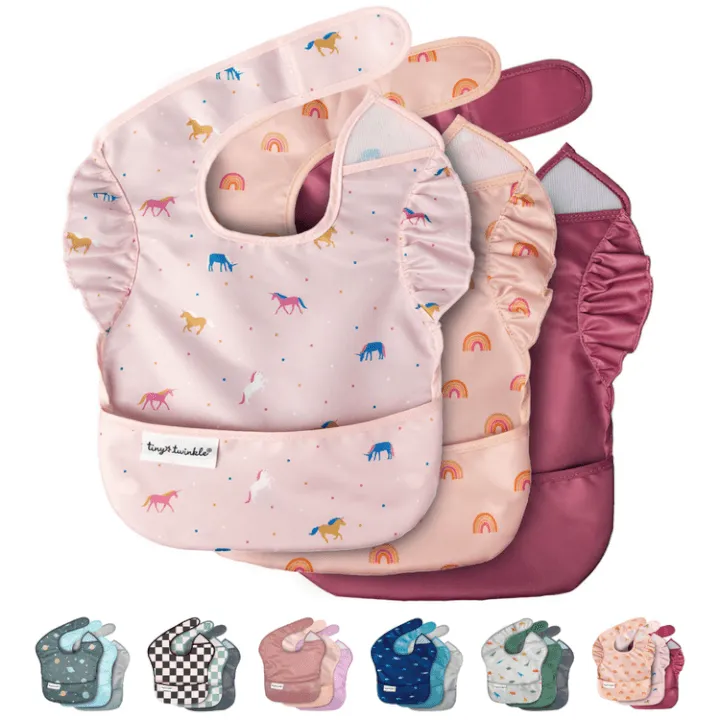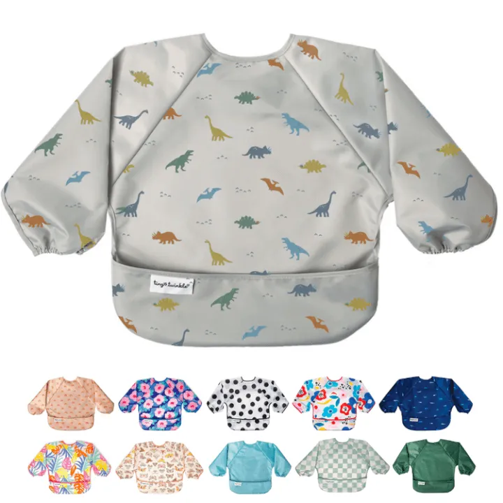 True mess-proof protection can be had with these full coverage bibs for babies and toddlers! They feature a tug proof back closure, large catch-all pocket and long sleeves with elasticized cuffs.